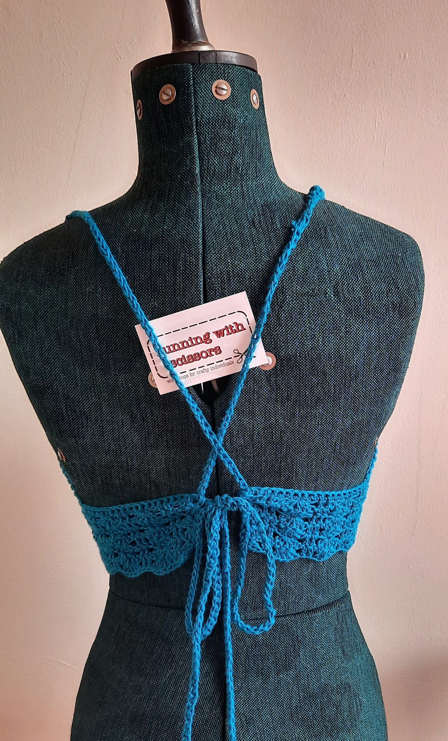 Handcrafted crochet summer top with crochet strap and cross back detail. Bright teal colour, 100% cotton yarn. Includes bra cups sewn into the inside. Fits approximately ladies size 10-12.